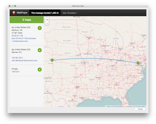 MailHops maps your email, first message sent/received traveled 5,000 miles from Richmond, VA to Cambridge, MA via Provo, UT. Launches the Thunderbird plugin.
